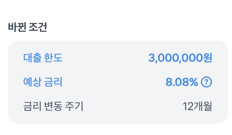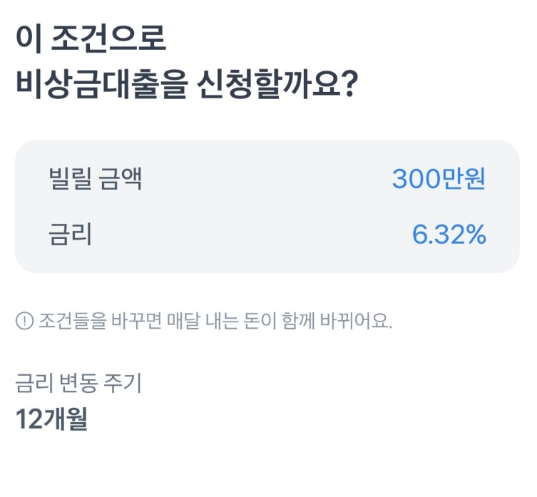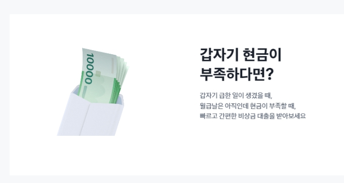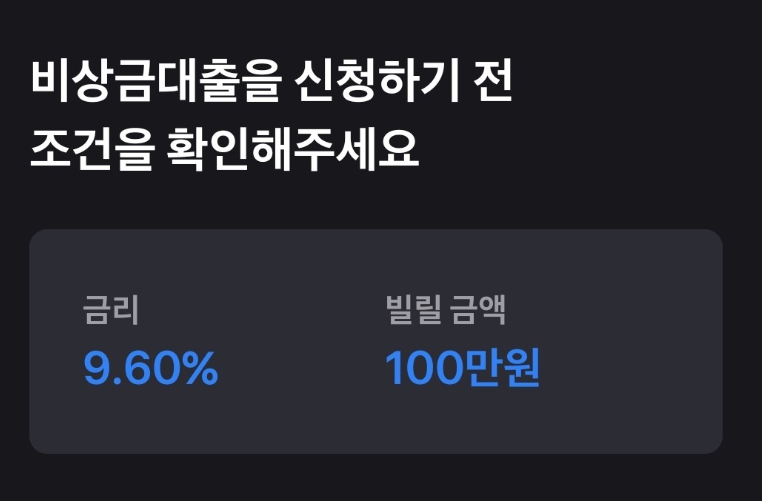 신용등급에 따라 다르지만, 최소 50만 원에서 최대 300만 원까지 대출이 가능합니다. 휴대폰 본인 인증만으로 신용점수 조회 후 바로 비상금대출을 사용할 수 있으며, 계좌에서 바로 출금이 가능합니다. 대출 기간은 1년으로 만기일시상환하거나, 당장 상환이 힘든 경우 1년 단위로 최대 10년까지 연장이 가능합니다.