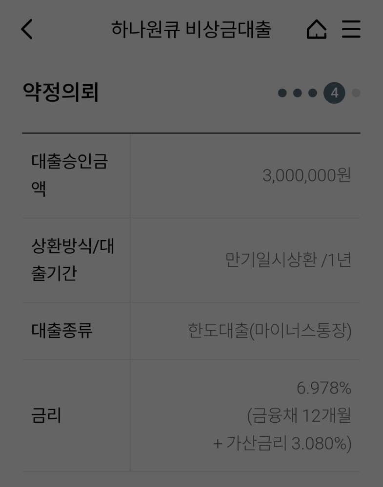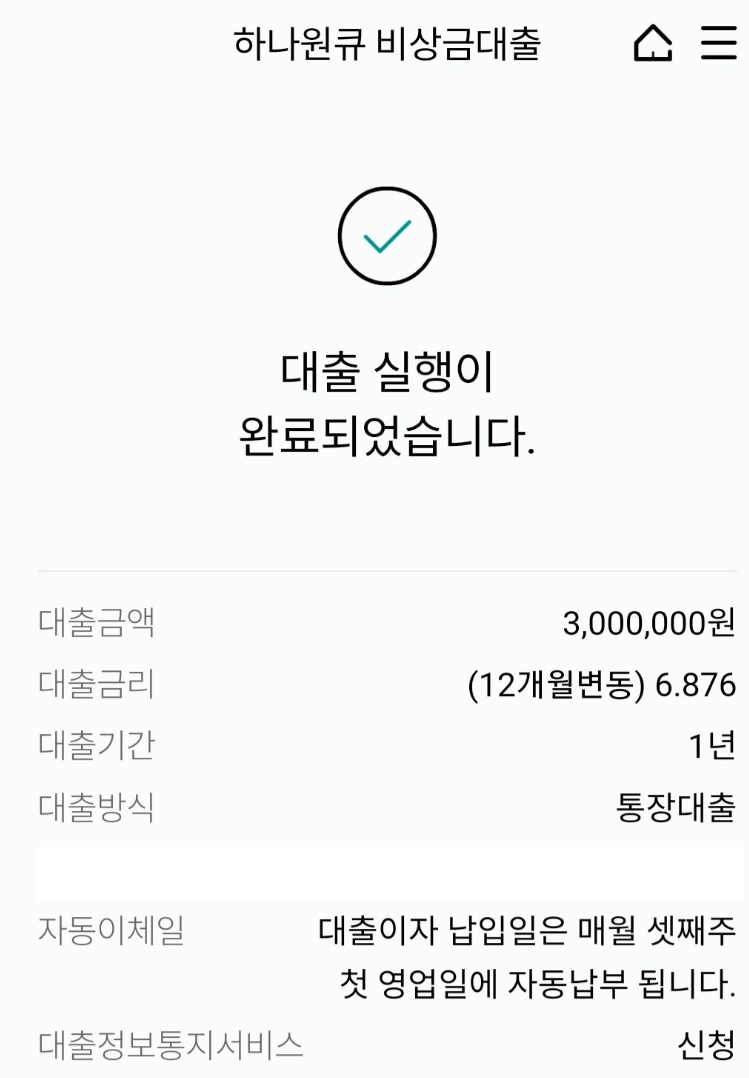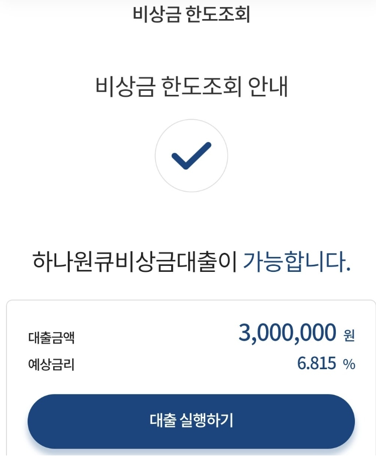 신용등급에 따라 다르지만, 최소 50만 원에서 최대 300만 원까지 대출이 가능합니다. 하나원큐 어플에서 휴대폰 본인 인증만으로 신용점수를 조회한 후 바로 비상금대출을 사용할 수 있으며, 계좌에서 바로 출금이 가능합니다. 대출 기간은 1년으로 만기일시상환하거나, 당장 상환이 힘든 경우 기간 연장이 가능합니다.