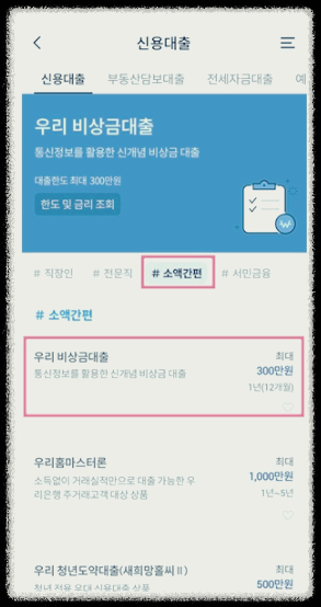 - '신용대출' 화면에서 '#소액간편'에 있는 '우리 비상금대출'을 클릭하여 신청합니다.